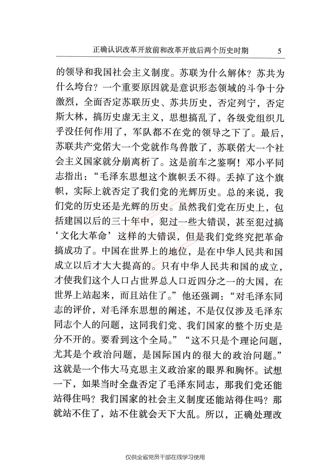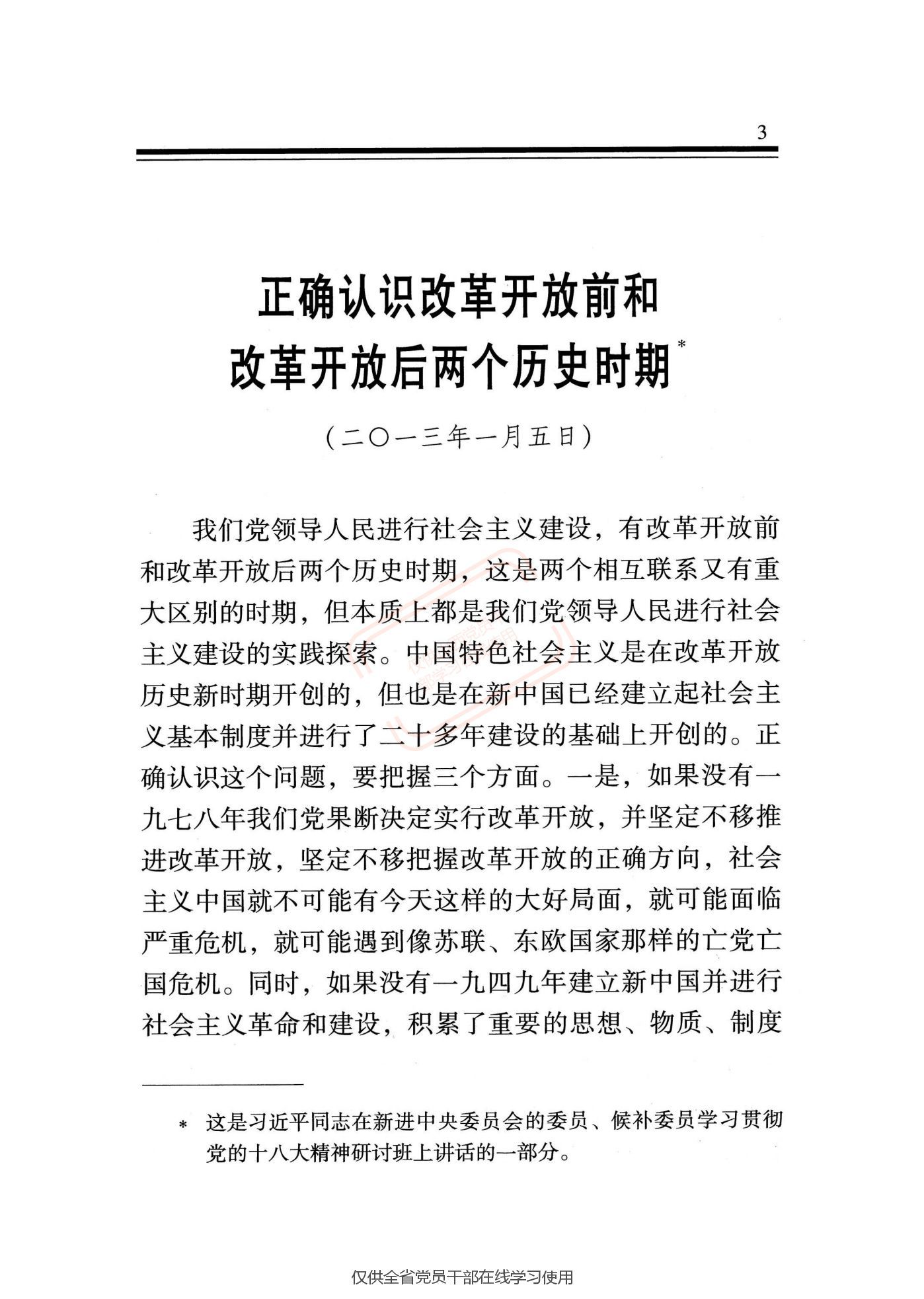 《正确认识改革开放前和改革开放后两个历史时期》是2013年1月5日习近平同志在新进中央委员会的委员、候补委员学习贯彻党的十八大精神研讨班上讲话的一部分。指出:我们党领导人民进行社会主义建设,有改革开放前和改革开放后两个历史时期,这是两个相互联系又有重大区别的时期,但本质上都是我们党领导人民进行社会主义建设的实践探索。不能用改革开放后的历史时期否定改革开放前的历史时期,也不能用改革开放前的历史时期否定改革开放后的历史时期。改革开放前的社会主义实践探索为改革开放后的社会主义实践探索积累了条件,改革开放后的社会主义实践探索是对前一个时期的坚持、改革、发展。