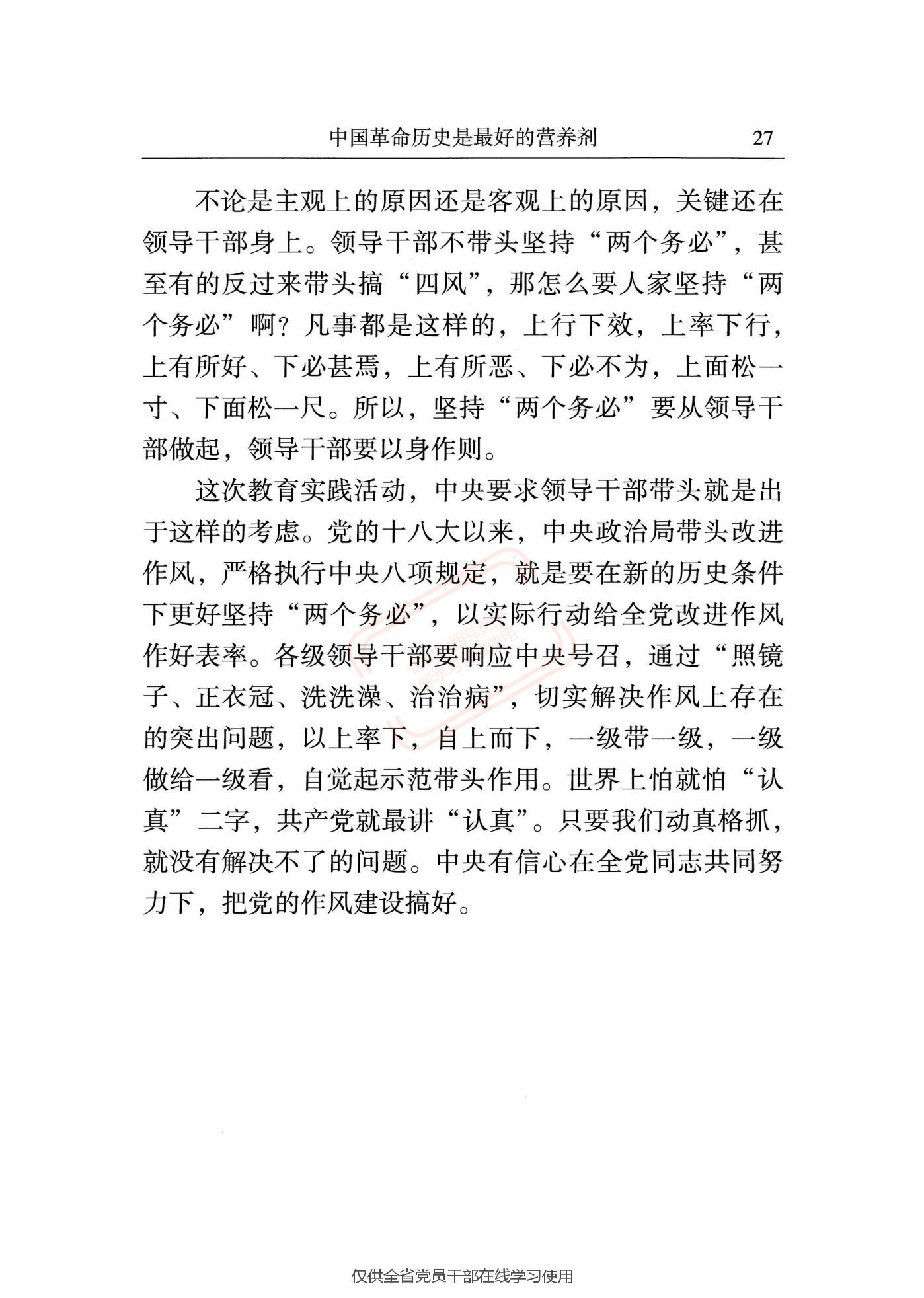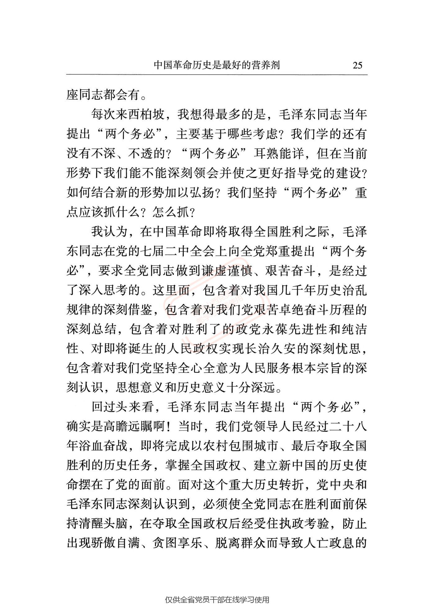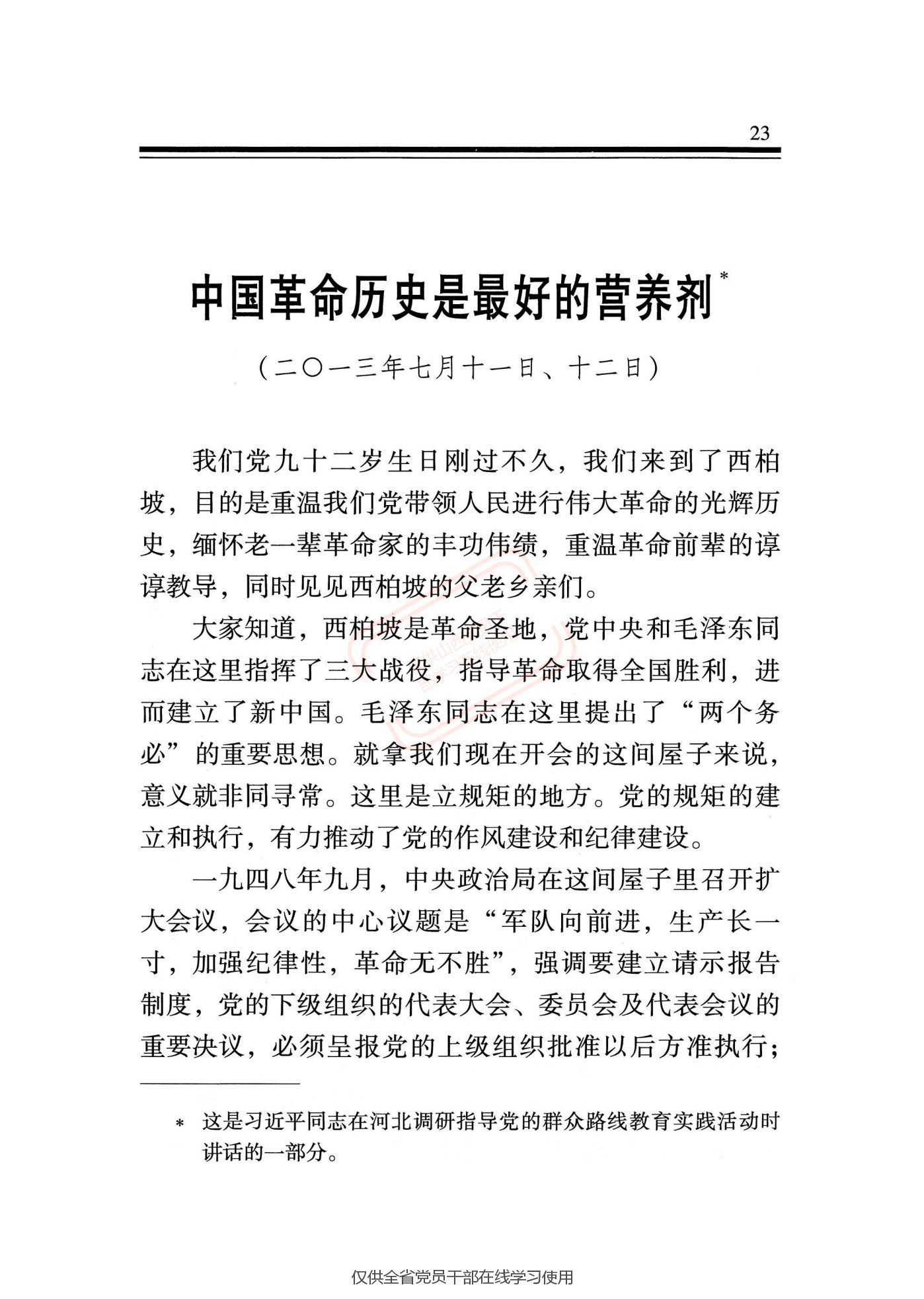《中国革命历史是最好的营养剂》是2013年7月11日、12日习近平同志在河北调研指导党的群众路线教育实践活动时讲话的一部分。指出:西柏坡是革命圣地,党中央和毛泽东同志在这里指挥了三大战役,指导革命取得全国胜利,进而建立了新中国。毛泽东同志在这里提出了“两个务必”的重要思想。就拿我们现在开会的这间屋子来说,意义就非同寻常。这里是立规矩的地方。党的规矩的建立和执行,有力推动了党的作风建设和纪律建设。对毛泽东同志提出“两个务必”的深邃思想和战略考虑,我们要不断学习领会。我们要不断向全党严肃郑重地提出这个问题,始终做到谦虚谨慎、艰苦奋斗,使我们的党永远不变质、我们的红色江山永远不变色。