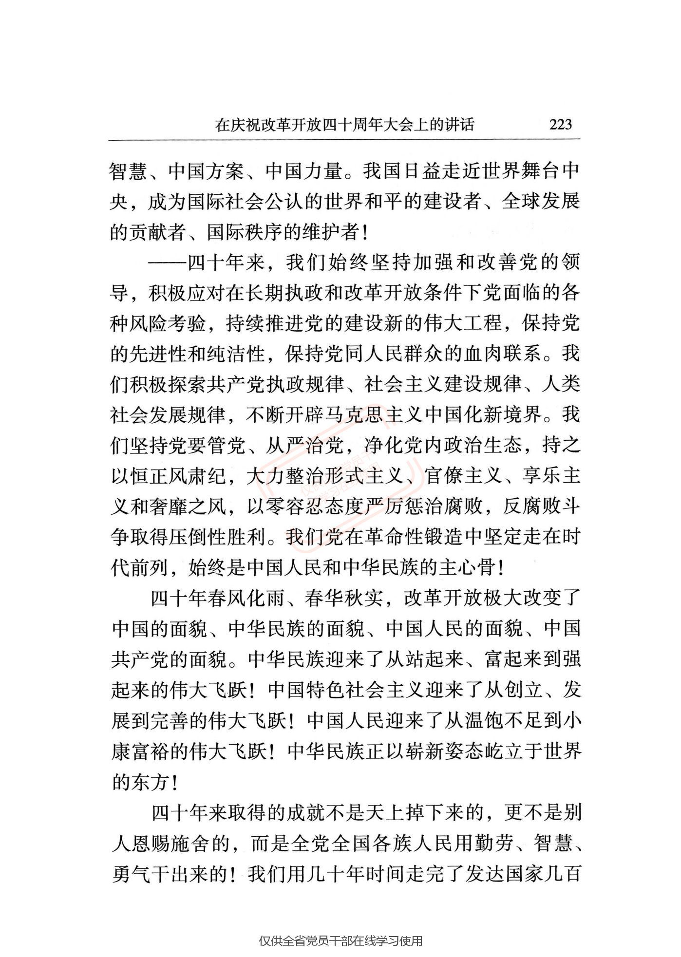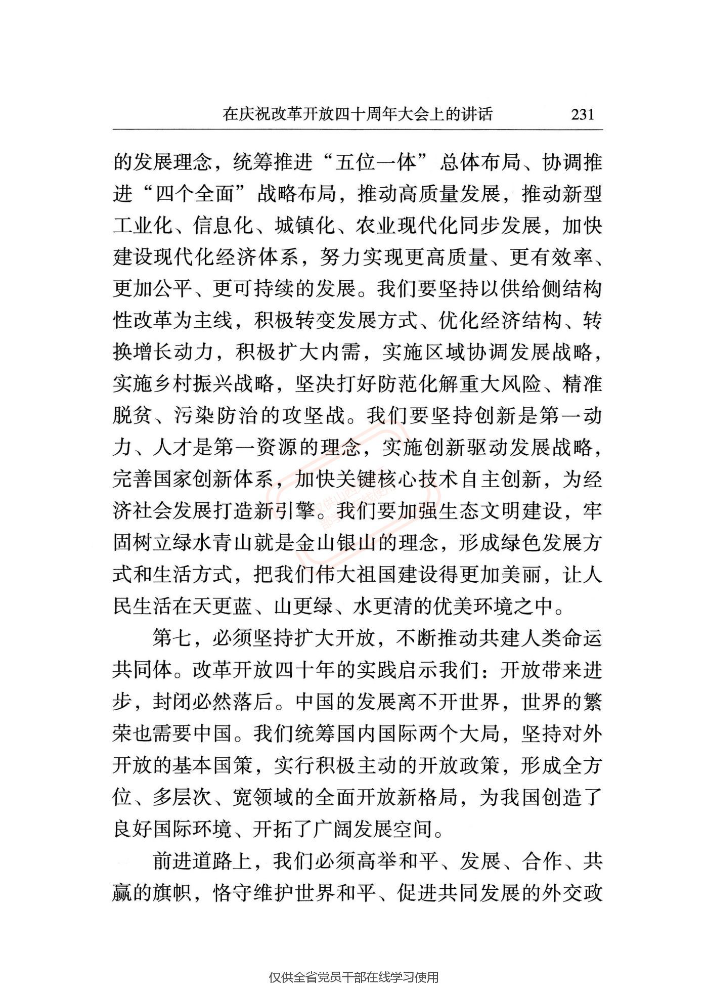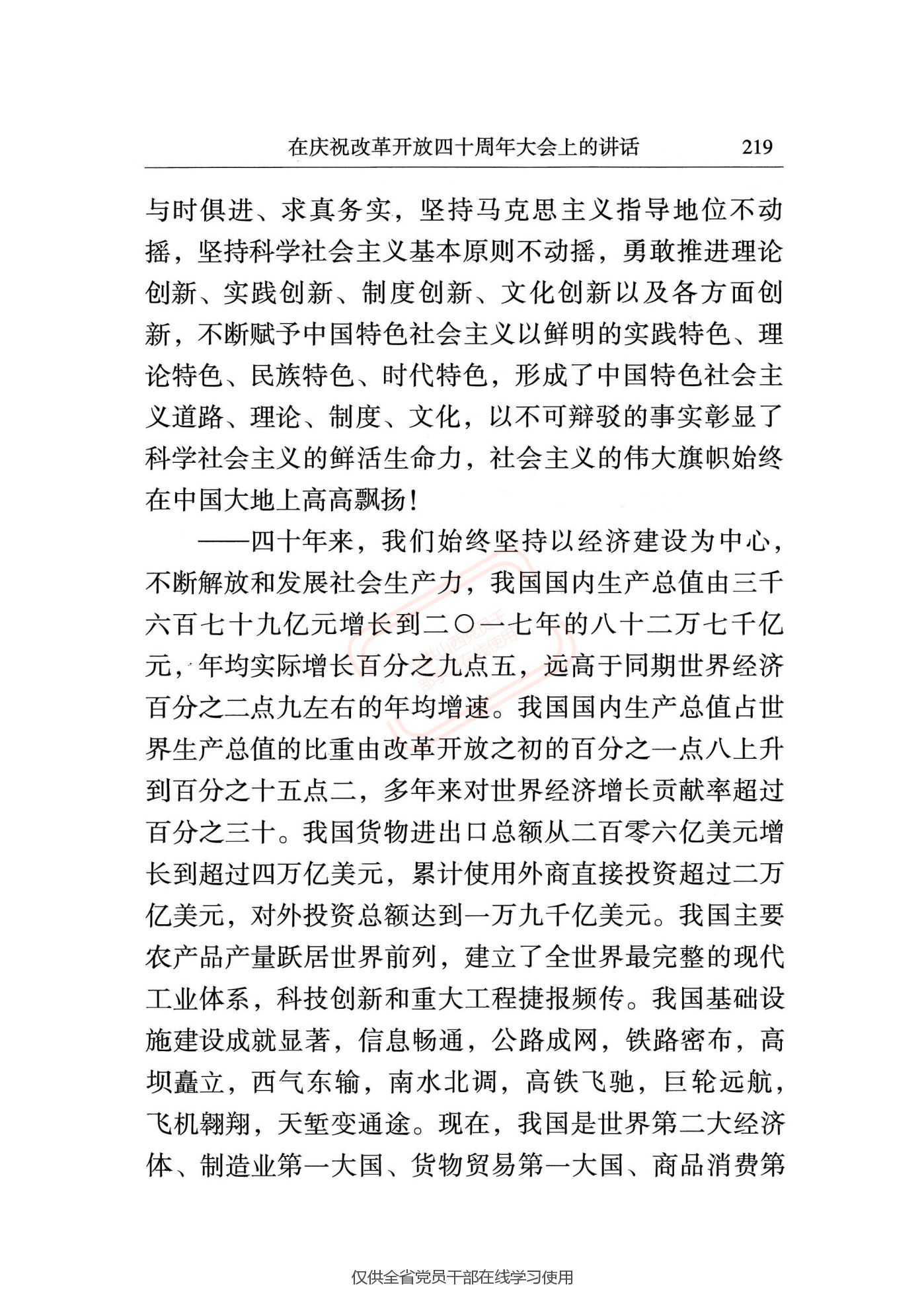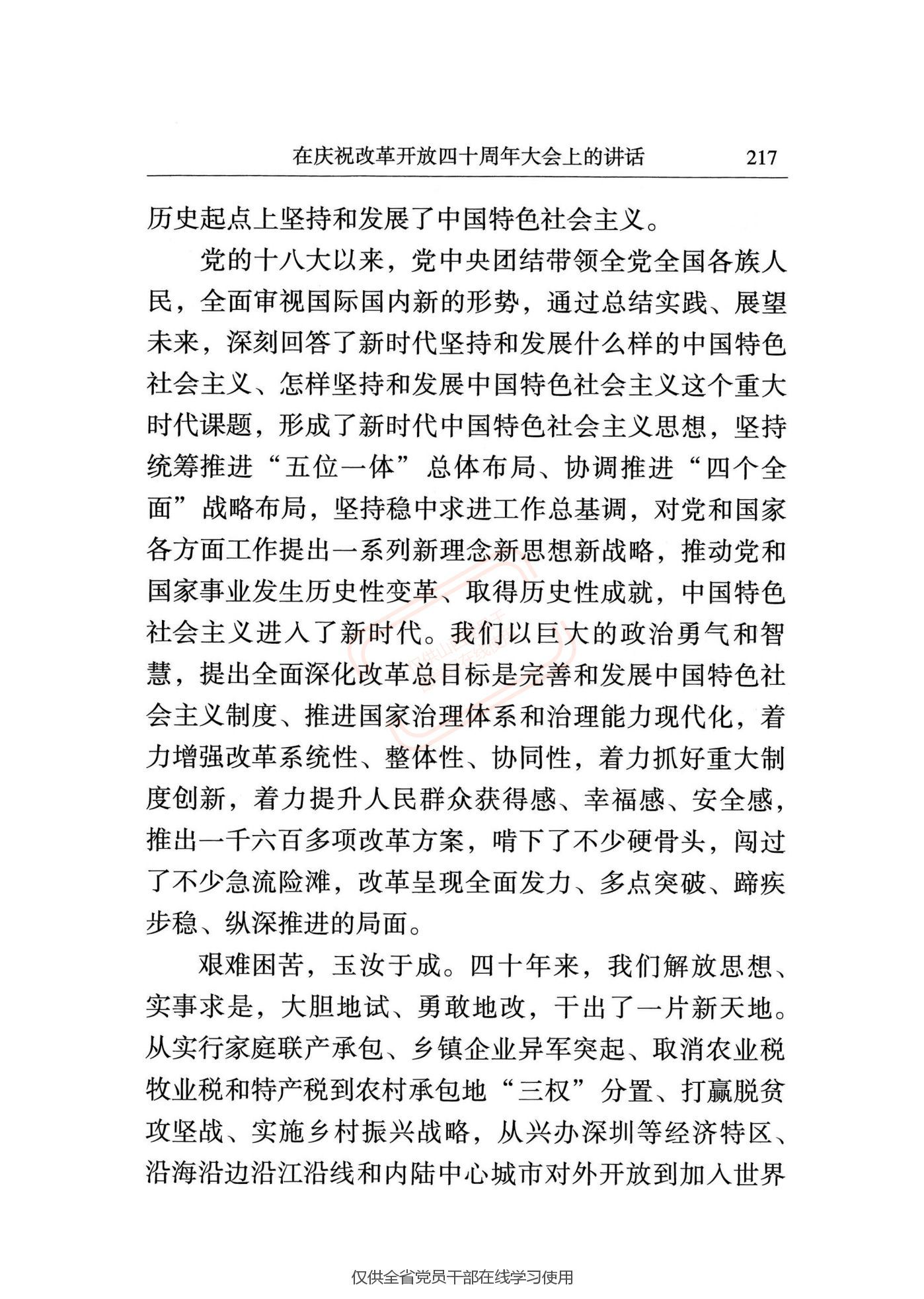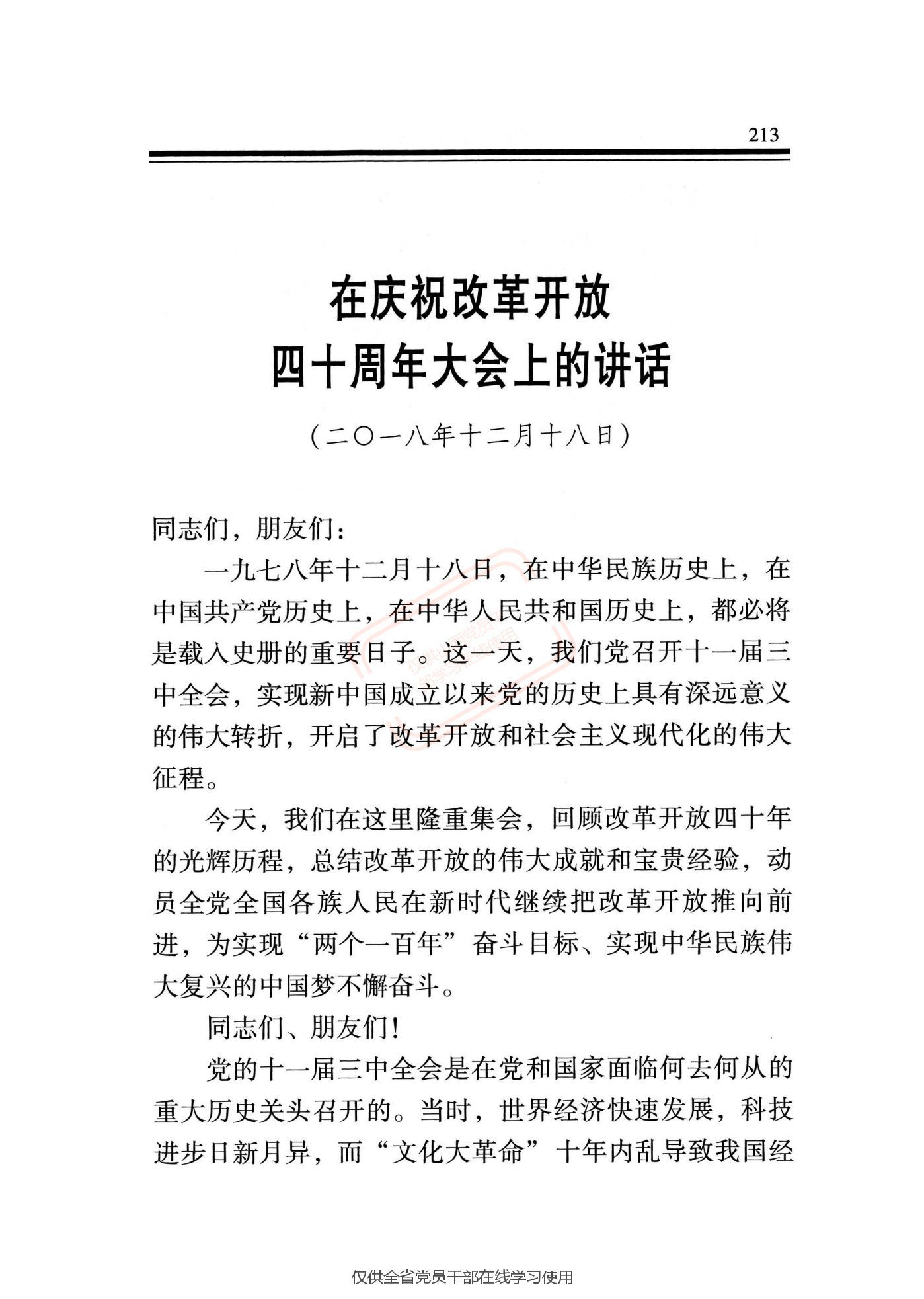 《在庆祝改革开放四十周年大会上的讲话》是2018年12月18日习近平同志的讲话。讲话深刻总结了改革开放四十年来党和国家事业取得的伟大成就和宝贵经验,高度赞扬了中国人民为改革开放事业作出的杰出贡献,郑重宣示了改革开放只有进行时没有完成时、改革开放永远在路上、坚定不移将改革开放进行到底的信心和决心,明确提出了坚定不移全面深化改革、扩大对外开放、不断把新时代改革开放继续推向前进的目标要求。指出:改革开放是我们党的一次伟大觉醒,正是这个伟大觉醒孕育了我们党从理论到实践的伟大创造。改革开放是中国人民和中华民族发展史上一次伟大革命,正是这个伟大革命推动了中国特色社会主义事业的伟大飞跃!改革开放四十年积累的宝贵经验是党和人民弥足珍贵的精神财富,对新时代坚持和发展中国特色社会主义有着极为重要的指导意义,必须倍加珍惜、长期坚持,在实践中不断丰富和发展。