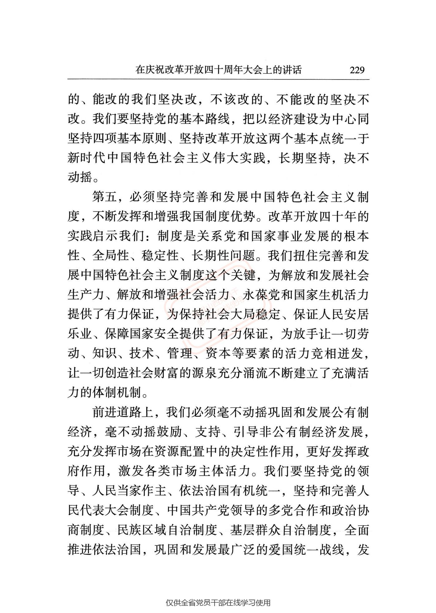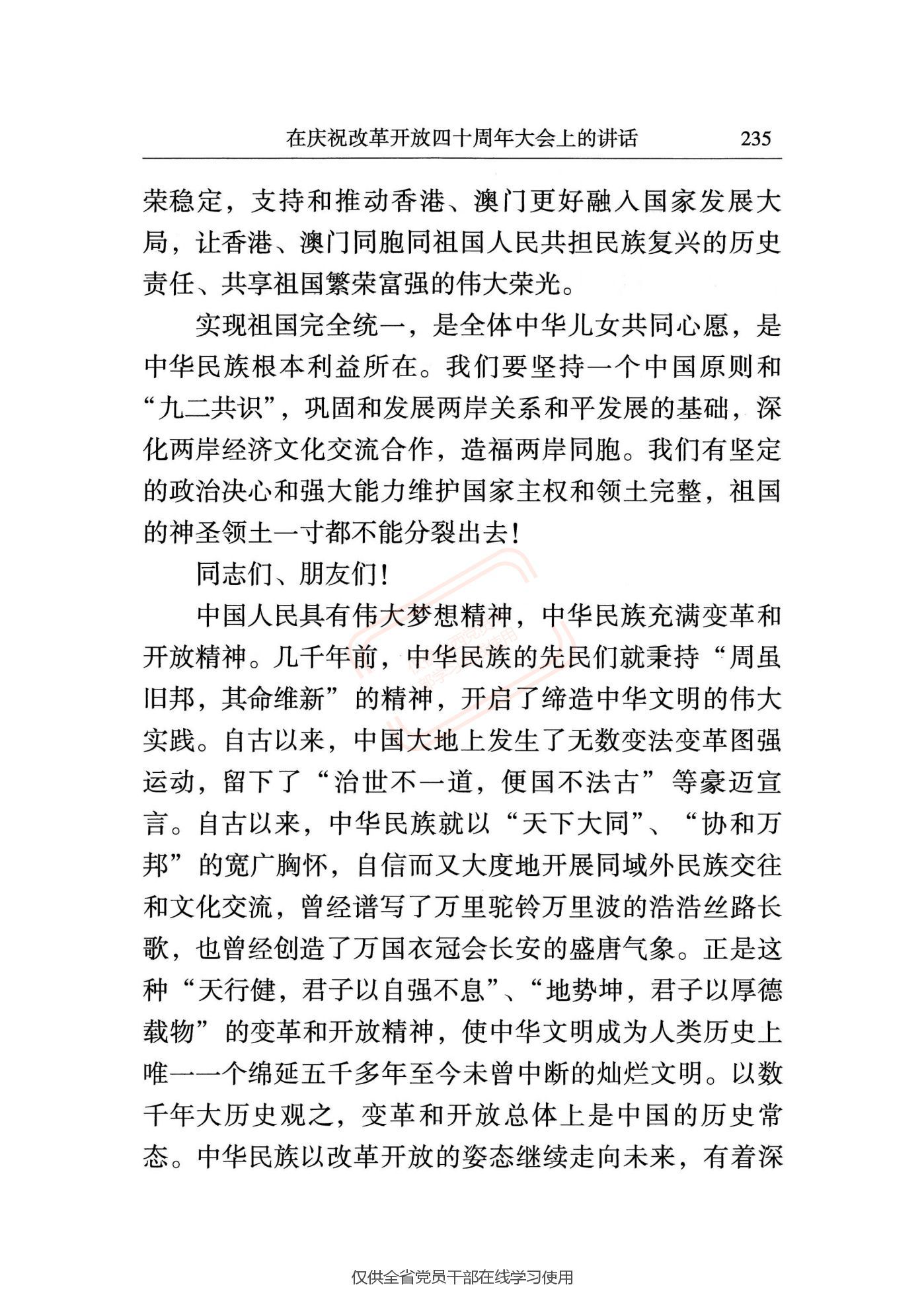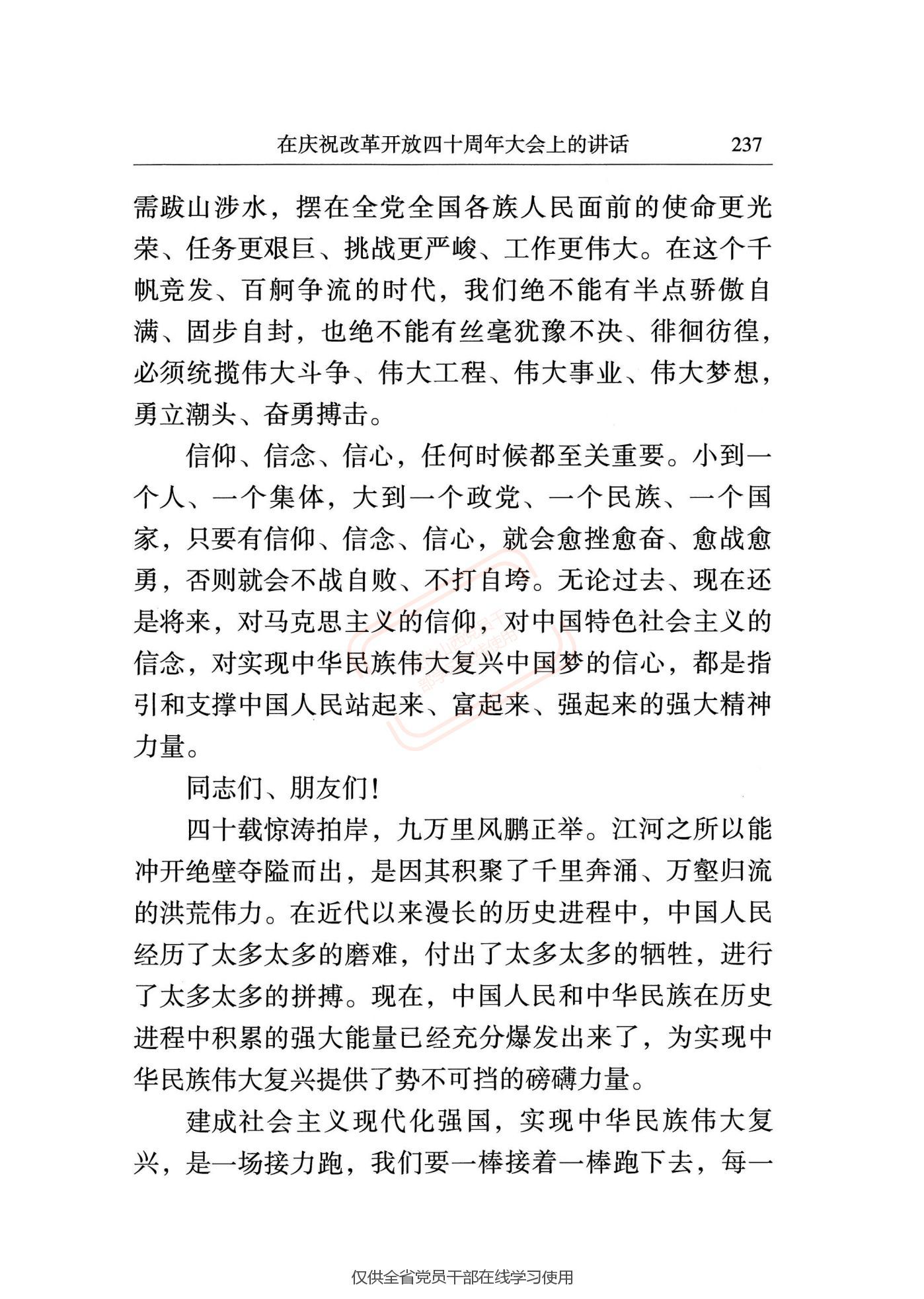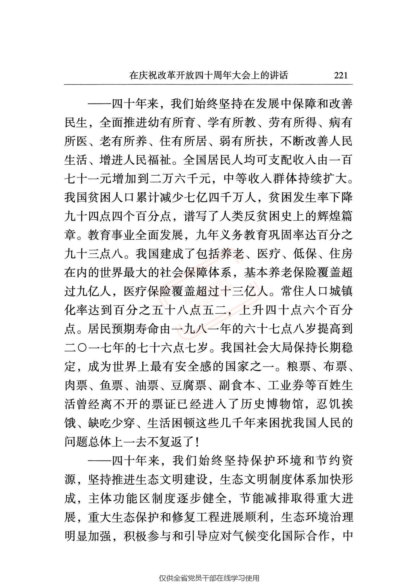 《在庆祝改革开放四十周年大会上的讲话》是2018年12月18日习近平同志的讲话。讲话深刻总结了改革开放四十年来党和国家事业取得的伟大成就和宝贵经验,高度赞扬了中国人民为改革开放事业作出的杰出贡献,郑重宣示了改革开放只有进行时没有完成时、改革开放永远在路上、坚定不移将改革开放进行到底的信心和决心,明确提出了坚定不移全面深化改革、扩大对外开放、不断把新时代改革开放继续推向前进的目标要求。指出:改革开放是我们党的一次伟大觉醒,正是这个伟大觉醒孕育了我们党从理论到实践的伟大创造。改革开放是中国人民和中华民族发展史上一次伟大革命,正是这个伟大革命推动了中国特色社会主义事业的伟大飞跃!改革开放四十年积累的宝贵经验是党和人民弥足珍贵的精神财富,对新时代坚持和发展中国特色社会主义有着极为重要的指导意义,必须倍加珍惜、长期坚持,在实践中不断丰富和发展。