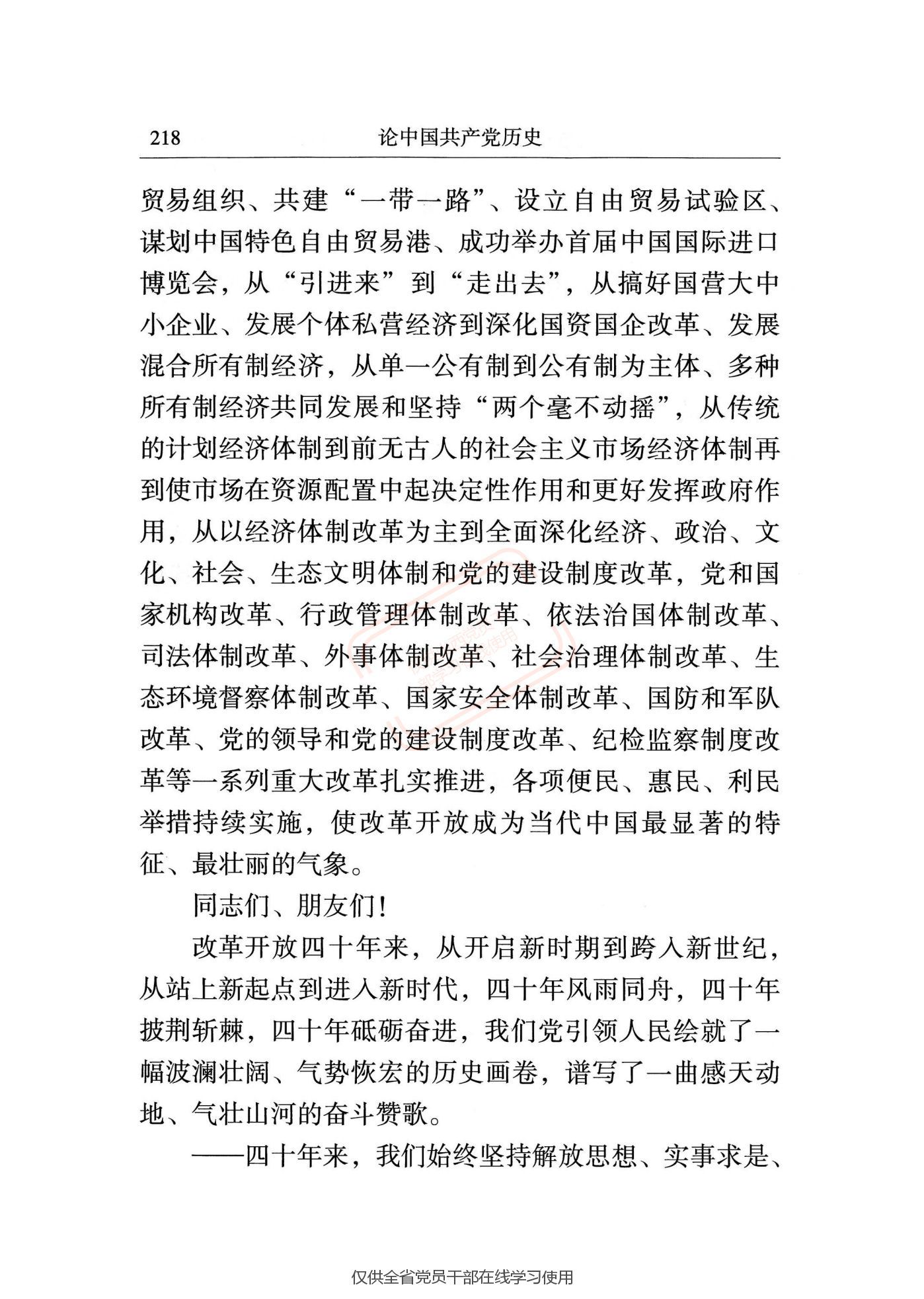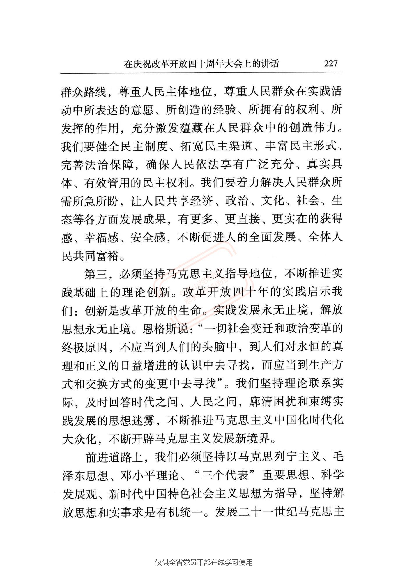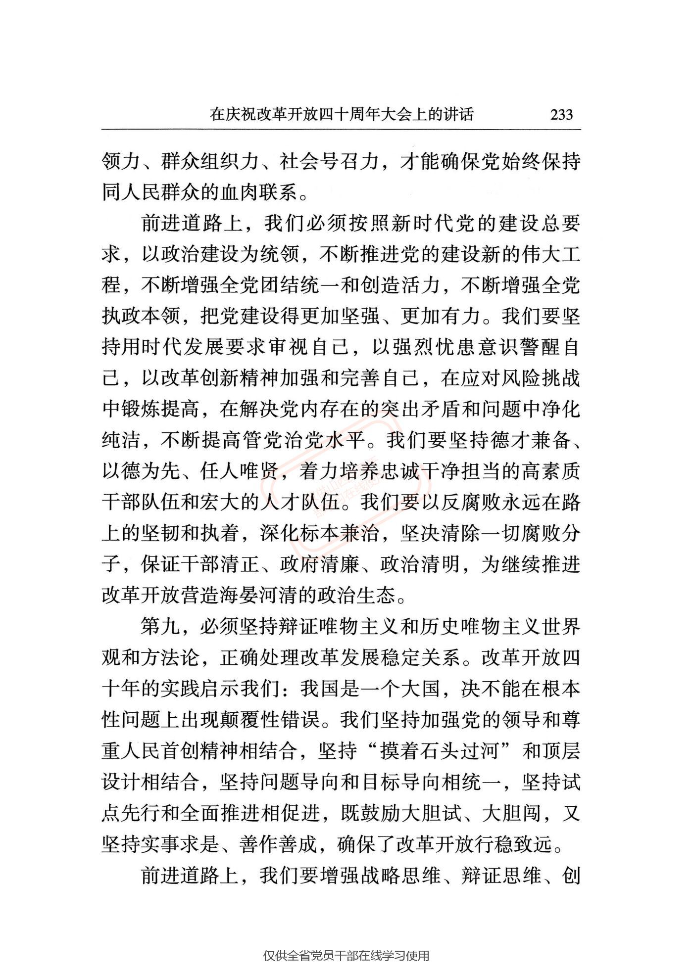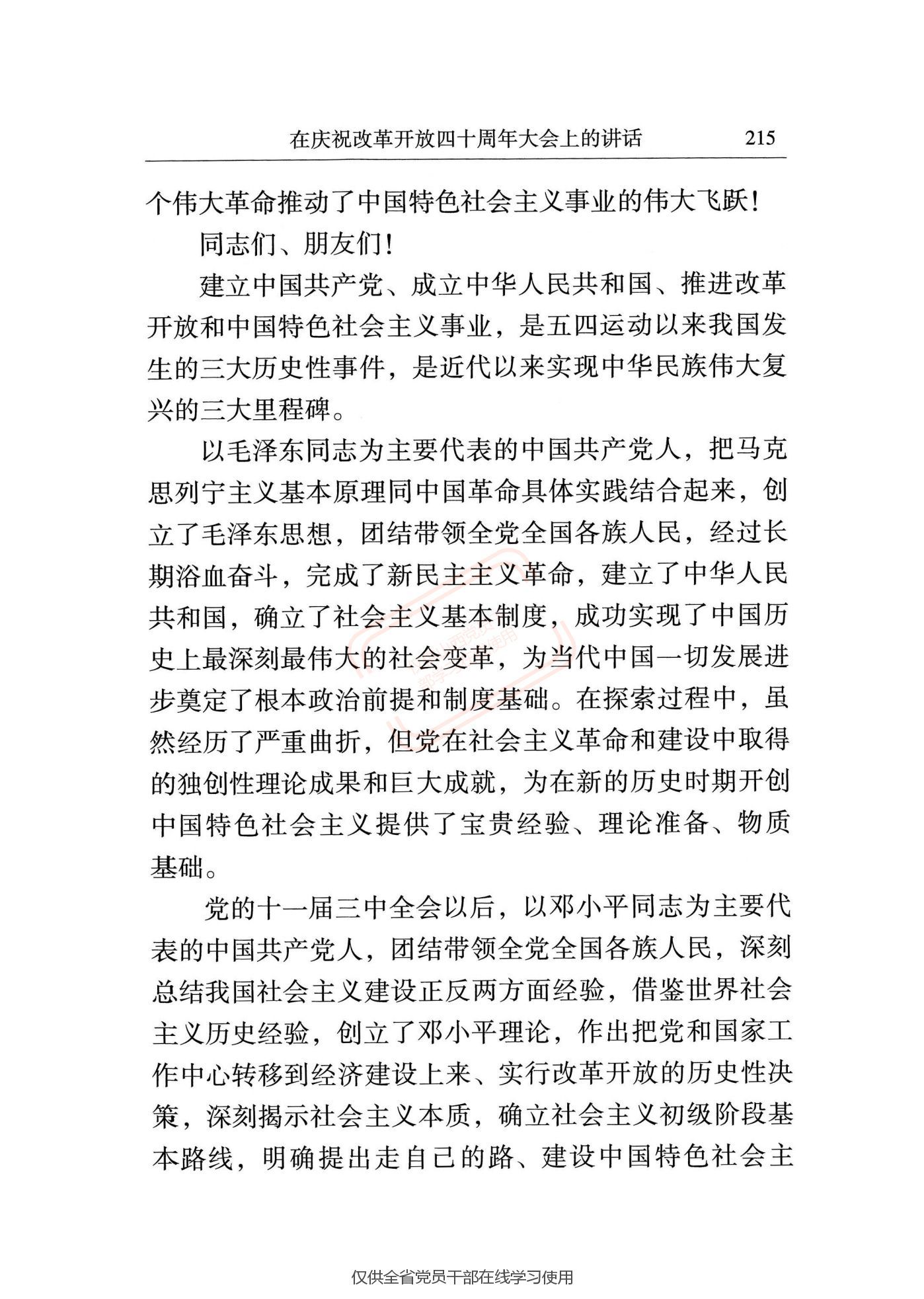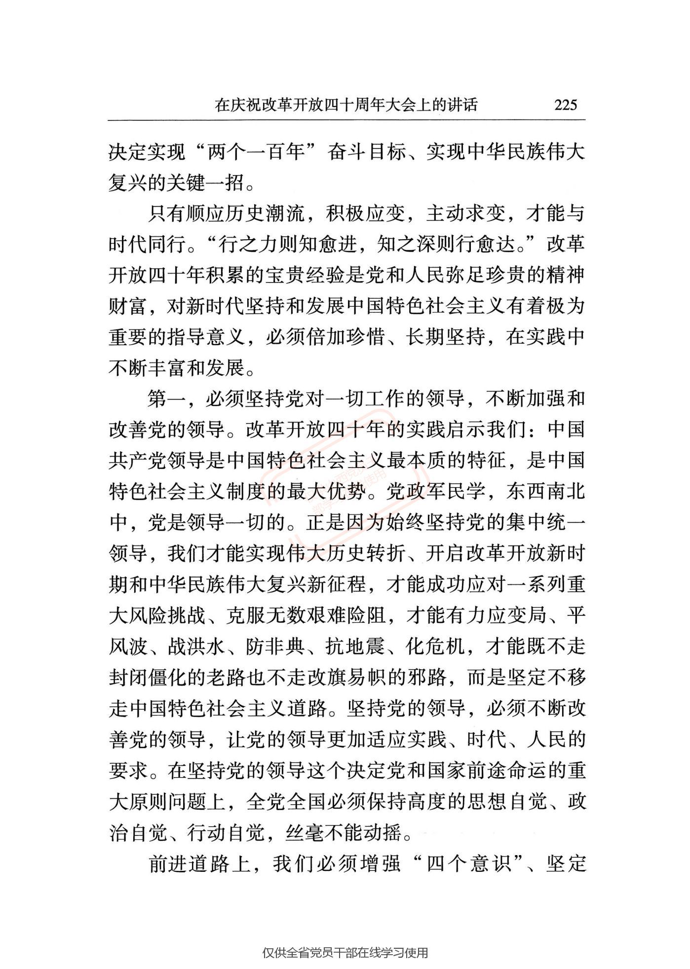 《在庆祝改革开放四十周年大会上的讲话》是2018年12月18日习近平同志的讲话。讲话深刻总结了改革开放四十年来党和国家事业取得的伟大成就和宝贵经验,高度赞扬了中国人民为改革开放事业作出的杰出贡献,郑重宣示了改革开放只有进行时没有完成时、改革开放永远在路上、坚定不移将改革开放进行到底的信心和决心,明确提出了坚定不移全面深化改革、扩大对外开放、不断把新时代改革开放继续推向前进的目标要求。指出:改革开放是我们党的一次伟大觉醒,正是这个伟大觉醒孕育了我们党从理论到实践的伟大创造。改革开放是中国人民和中华民族发展史上一次伟大革命,正是这个伟大革命推动了中国特色社会主义事业的伟大飞跃!改革开放四十年积累的宝贵经验是党和人民弥足珍贵的精神财富,对新时代坚持和发展中国特色社会主义有着极为重要的指导意义,必须倍加珍惜、长期坚持,在实践中不断丰富和发展。