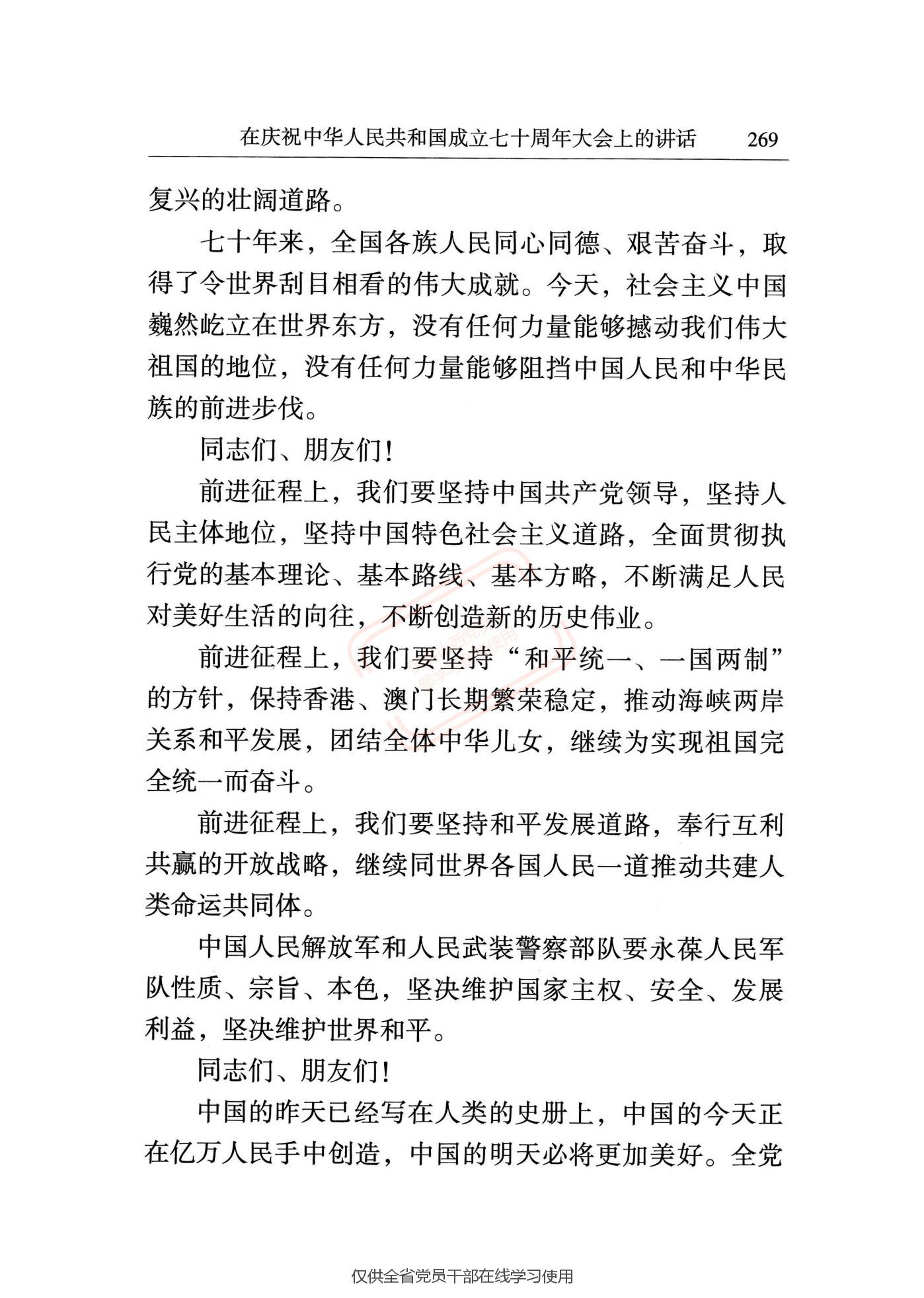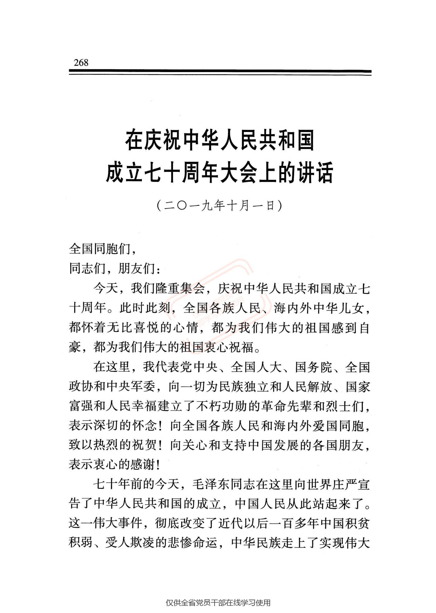 《在庆祝中华人民共和国成立七十周年大会上的讲话》是2019年10月1日习近平同志的讲话。回顾了七十年前新中国成立这一伟大事件,赞扬了七十年来全国各族人民取得的令世界刮目相看的伟大成就,宣示了前进征程上不断创造新的历史伟业的坚强决心和坚定信心。指出:七十年来,全国各族人民同心同德、艰苦奋斗,取得了令世界刮目相看的伟大成就。今天,社会主义中国巍然屹立在世界东方,没有任何力量能够撼动我们伟大祖国的地位,没有任何力量能够阻挡中国人民和中华民族的前进步伐。中国的昨天已经写在人类的史册上,中国的今天正在亿万人民手中创造,中国的明天必将更加美好。