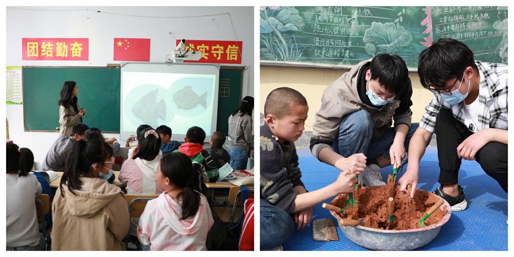 支教成员们课前认真备课,认真梳理自身所学知识并融入党史知识背景,同时根据不同年龄段的学生选择适宜的课程内容,精心制成课件。陶艺专业的同学们以课堂讲授与实际操作相结合,并用孩子们喜闻乐见的方式组织教学活动;唱红歌更是加强支教团队文化建设的重要活动形式,研究生支教团的两位党员以《编花篮》、《共产主义儿童团团歌》为素材讲述党史故事,激发起小朋友们的爱党爱国热情,当歌曲响起的瞬间,如火的激情与奋发的力量油然而生!
